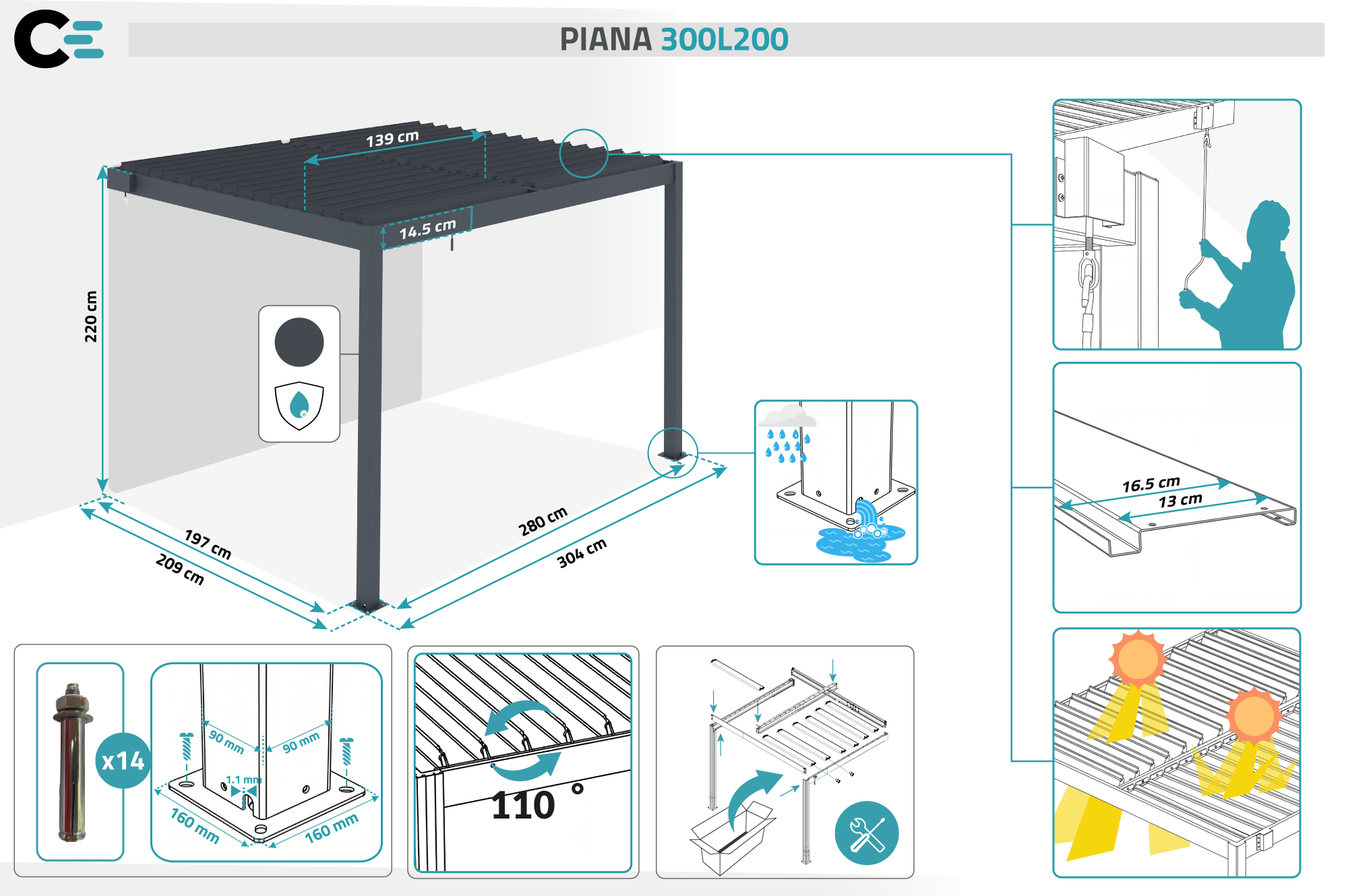 Met de PIANA bioclimatische pergola transformeert u uw terras het hele jaar door in een aangename plek. De lamellen, verstelbaar tot 110°, passen zich aan de wisselende weersomstandigheden aan: effectieve bescherming tegen regen of verfrissende schaduw. Deze stijlvolle bioclimatische pergola is stevig verankerd aan uw gevel en garandeert stabiliteit en duurzaamheid. De hoogwaardige aluminium constructie biedt uitstekende windbestendigheid en zorgt voor optimaal comfort.